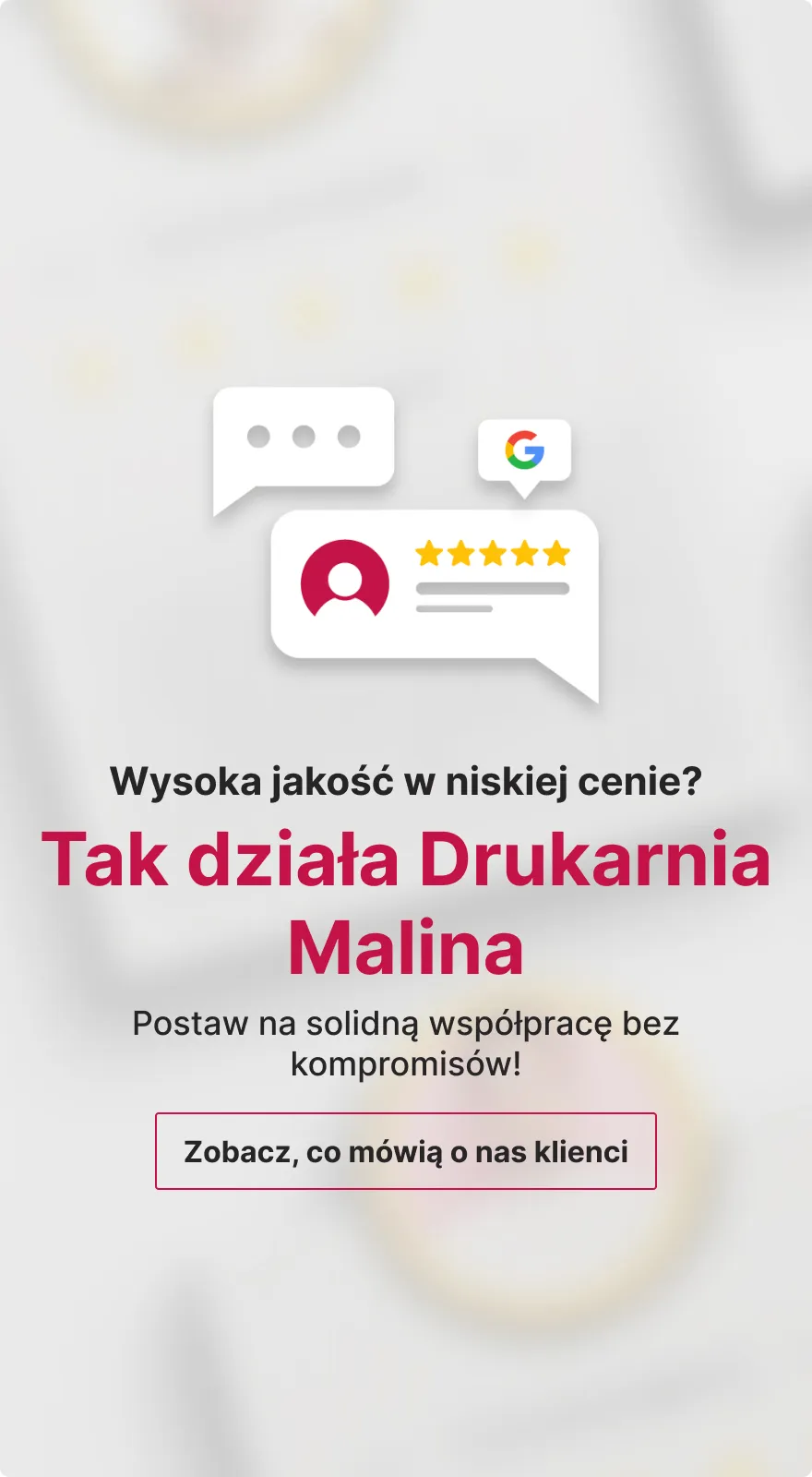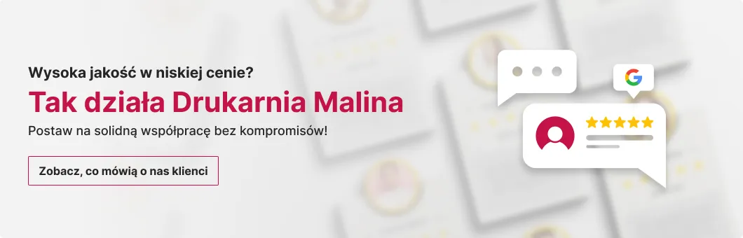 W Drukarni Malina zrealizujesz każde zamówienie, nawet najbardziej złożone! Opracowaliśmy także specjalny dział z produktami dla hoteli i restauracji (HoReCa), w którym zamówisz wszystko, co potrzebne w gastronomii i hotelarstwie. Ponadto stale rozszerzamy ofertę i dopasowujemy do potrzeb naszych klientów. Jeśli masz specjalne wymagania lub pytania, to skontaktuj się z nami, a zobaczymy, co możemy dla Ciebie zrobić!